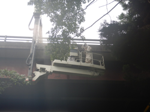 点検中、桁下部にスズメバチの巣を確認したため、受発注者間で連携し、安全を最優先に外注業者による除去を行いました。